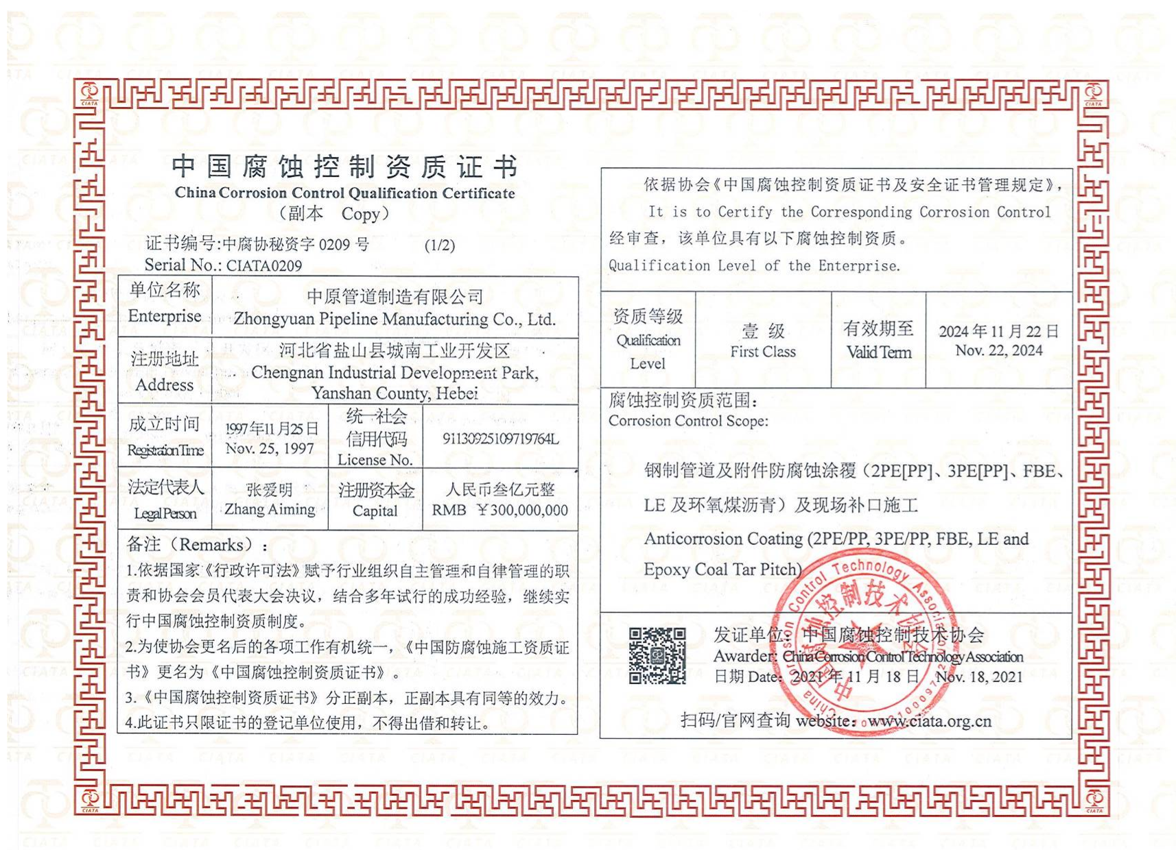 公司自2000年以來先後通過ISO9001國際質量管理體係認證,ISO14001國際環境管理體係認證,GB/T28001職業健康安全管理體係認證和中國石油天然氣集團公司(HSE)健康、安全與環境管理體係認證,美國石油學會API Spec Q1體係認證、API Spec 5L蜜桃视频APP入口認證,歐盟鍋爐壓力容器安全認證(PED),並獲得特種設備製造許可證(壓力管道)等體係認證和許可證書,2011年5月成為中國石油天然氣集團公司一級物資供應商,2012年成為中國國電集團公司和中國華電集團公司集團級合格供應商,2014年3月成為中國石油化工集團公司合格供應商,2015年12月公司榮獲中國防腐蝕施工壹級資質證書和中國防腐蝕安全證書,2017年3月“世興牌給水用環氧粉末複合鋼管”和“世興牌給水用液體環氧塗料複合鋼管”均獲得河北省國產涉及飲用水衛生安全蜜桃视频APP入口衛生許可批件。